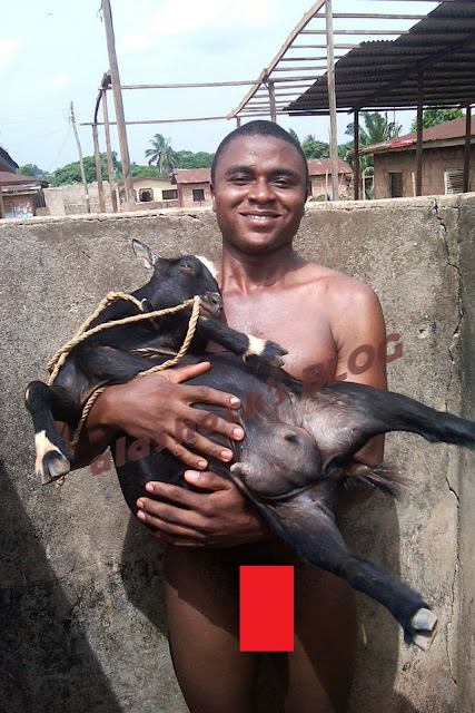 Really can’t find words to describe these shocking images of a self-acclaimed Nigerian gay who proudly stripped for cameras with a ‘kid goat’ around his shoulder, while holding a book that looks like a Bible on his left hand and on his right hand, two banners with bold inscriptions.