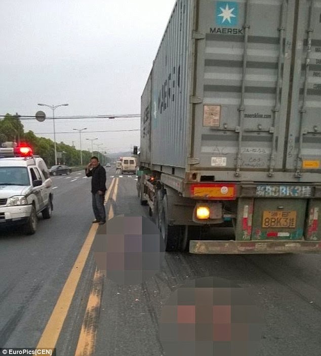 Horrific: A police officer stands next to the body parts of a baby girl who was killed when her mother threw her into the path of a lorry in a bitter row with her husband