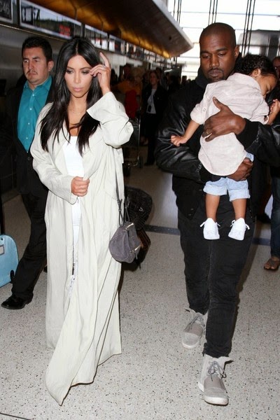 Reality star Kim Kardashian departing on a flight at LAX airport in Los Angeles, California with her husband Kanye West and their daughter North on Tuesday, April 7, 2015. Kanye West kept a firm hold of his precious daughter North, while Kim, 34, showed off her new hair extensions which transformed her hair from her recent short, platinum coloured tresses, back to a more natural brunette look for the special trip to Armenia.