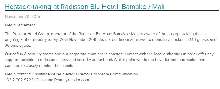 A statement from Rezidor Hotel Group, operator of the Mali hotel, said that 140 guests and 30 employees had been locked in.
