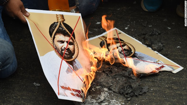 Activists burn photographs of Yakub Memon, convicted of plotting Mumbai bomb attacks which killed hundreds of people in 1993. |
